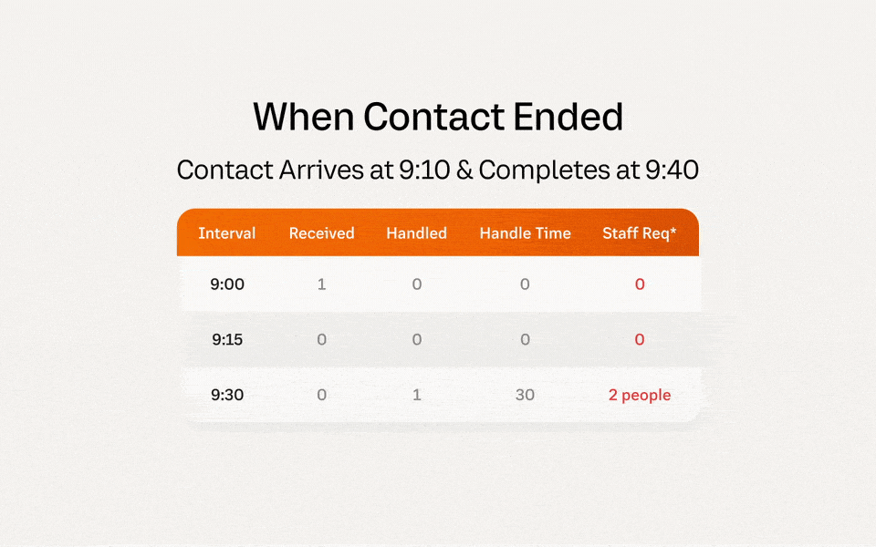 For example, an interaction that arrives at 9:10 and completes at 9:40 crosses multiple time intervals. TTI analytics accurately calculates the staff requirements based on the actual handle time per interval rather than having the total handle time in the final interval.