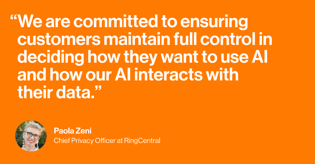 At RingCentral, trustworthy AI means protecting our customers and their data while maintaining our commitment to privacy, security, and transparency. This extends to the AI, down to the data it’s trained on, which is why we provide transparency about how our data is collected and used. We do not use customer data to train our AI models AND do not allow our third-party vendors to use our customers’ data to train the third-party’s AI models.